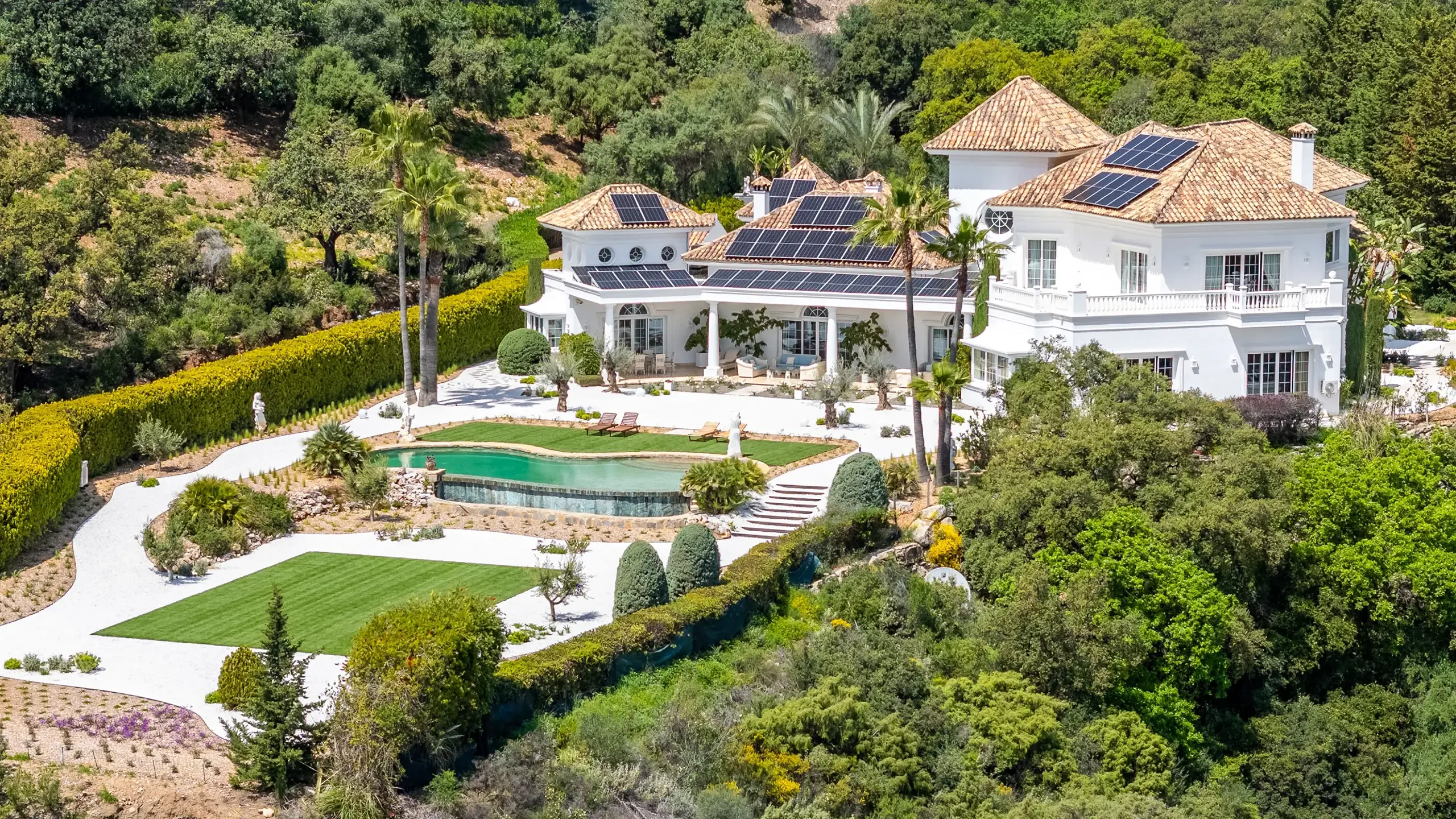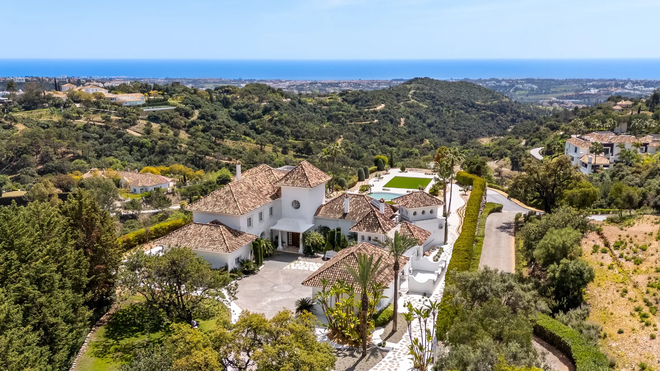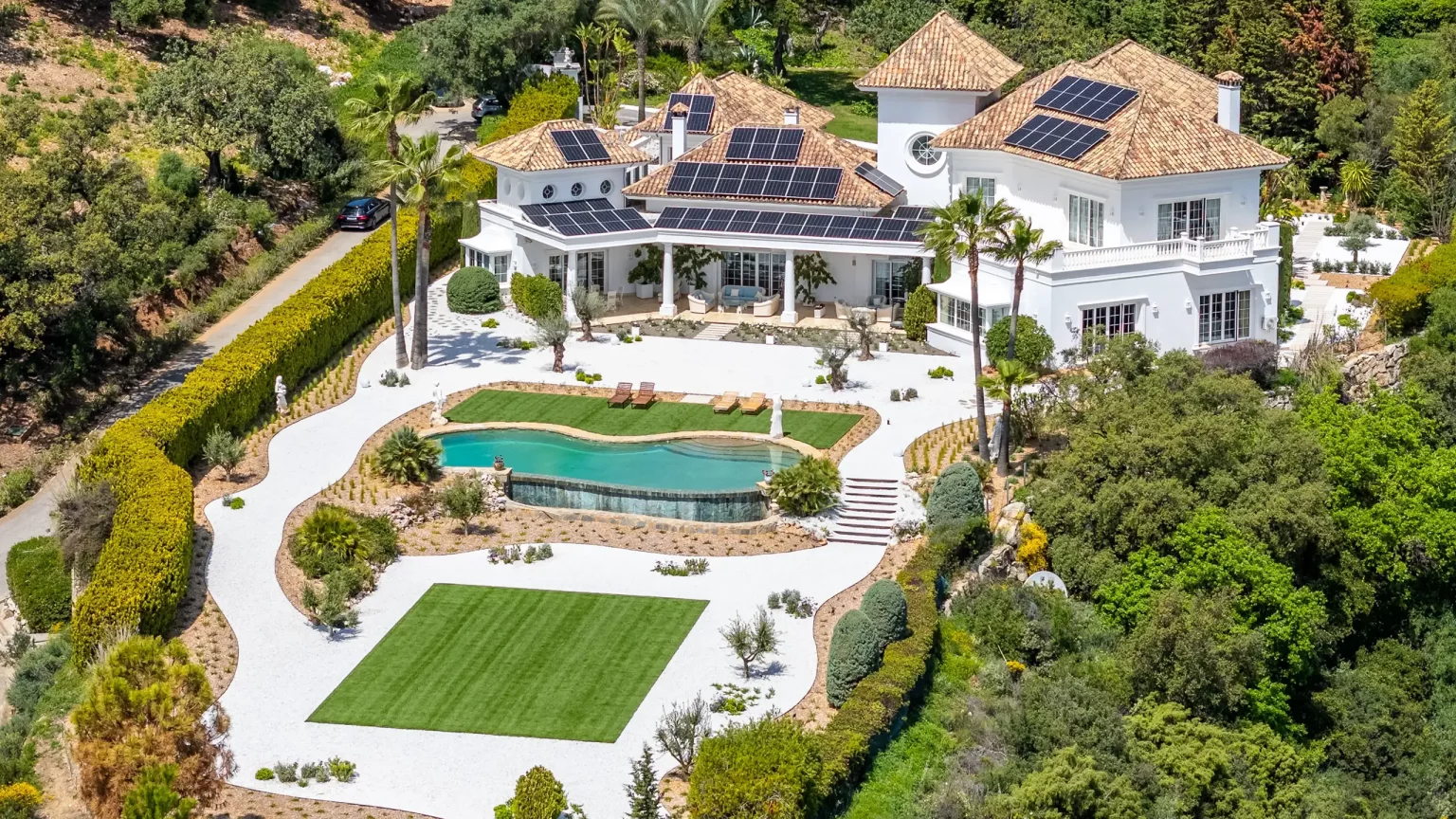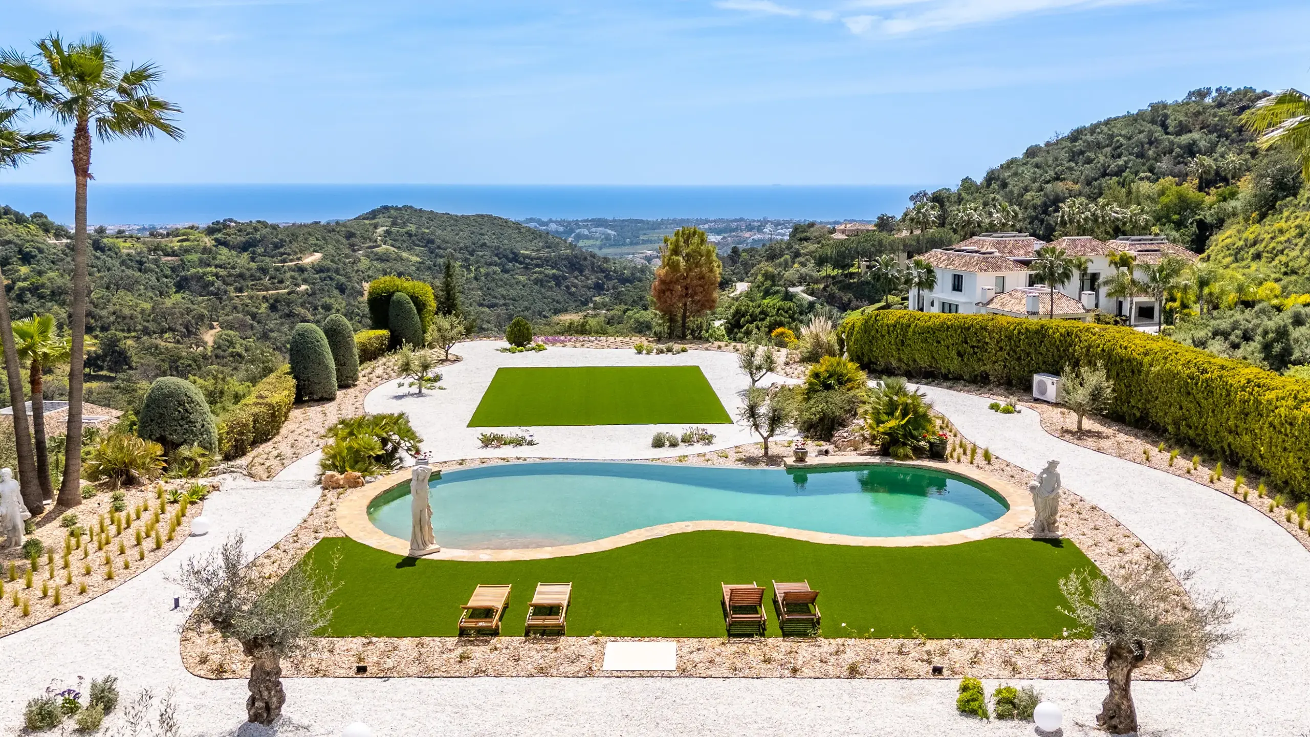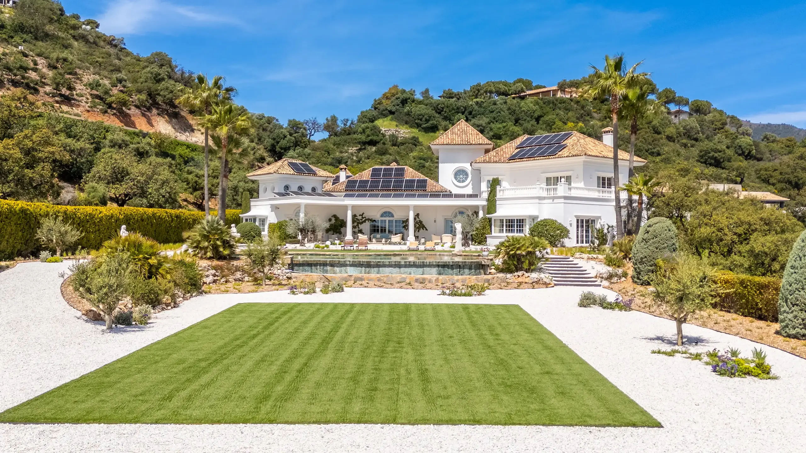 About Villa Infinita Villa Infinita is a large luxury villa in La Zagaleta designed for guests who value privacy, space and residential quality. Rather than relying on trend-led architecture, the property stands out through its land, views, room proportions and strong sense of calm. The main living spaces are elegant, generous and highly functional, with a grand double-height entrance hall, a principal living room opening onto a covered terrace, a formal dining room and a fully equipped kitchen with a breakfast area. A separate wing with an office and the games room adds flexibility for longer stays, family use or guests who want distinct areas for work and leisure. Three en-suite guest bedrooms on the ground floor enjoy direct garden access and private outdoor seating, while the upper floor includes the primary suite with a dressing room, a large bathroom, and a private terrace, as well as an additional en-suite guest bedroom with a balcony. Staff quarters and service areas further strengthen the villa’s appeal for longer and more fully supported stays. Outside, the villa is surrounded by mature landscaped gardens, walking paths and multiple covered and open-air terraces. Combined with the rare flat plot and wide sea views, this creates a more serene and estate-style environment than many luxury villas in Marbella, making Villa Infinita especially attractive to privacy-conscious families and international guests seeking a gated villa in La Zagaleta. What Makes Villa Infinita Exceptional Villa Features EXTERIOR LOCATION NEARBY BEACHES NEAREST AIRPORT(S) VILLA POLICIES